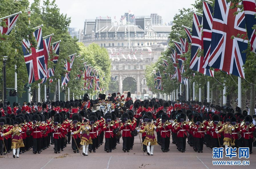 6月8日,在英国伦敦,士兵在英女王生日庆典活动上行进。 当日,英国伦敦举行盛大庆典,庆祝英女王93岁官方生日。 新华社发(雷伊·唐摄)