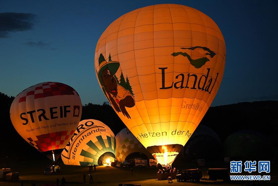 这是6月8日在德国波恩热气球节上拍摄的一场热气球点火表演。新华社记者 逯阳 摄