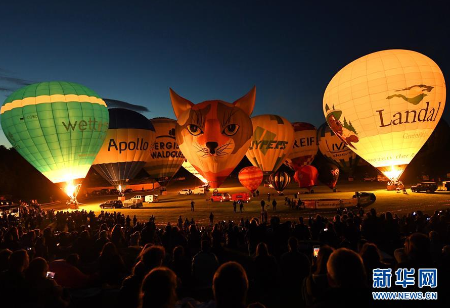 这是6月8日在德国波恩热气球节上拍摄的一场热气球点火表演。新华社记者 逯阳 摄