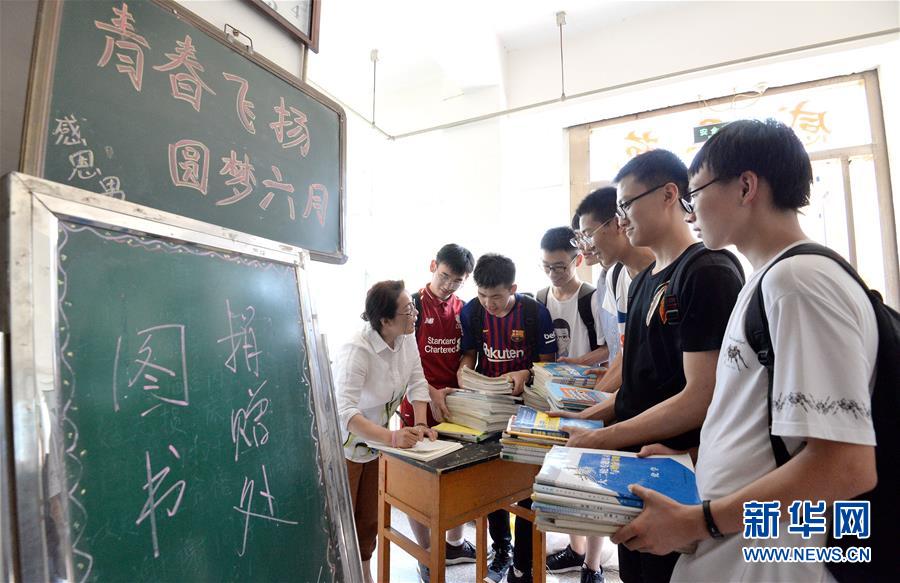 6月9日,在河北省邯郸市第一中学,高三毕业生整理同学们捐赠的书籍。 毕业之际,河北省邯郸市第一中学在高三年级开展“感恩母校,把知识留下”活动。学生将一部分图书进行义卖捐赠,另一部分经过集中整理,上架至学校“传梦书架”,供在校学生借阅。 新华社发(郝群英摄)