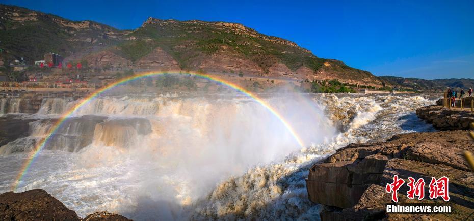 6月10日,黄河壶口瀑布水流湍急,巨浪翻滚,溅起巨大水雾。在蓝天白云的映衬之下,壶口瀑布旁边,彩虹高挂,色彩斑斓,再现“霓虹戏水”景观,吸引各地游客前来观赏拍照留念。据悉,“霓虹戏水”是壶口瀑布的八大景观之一。兰华 摄