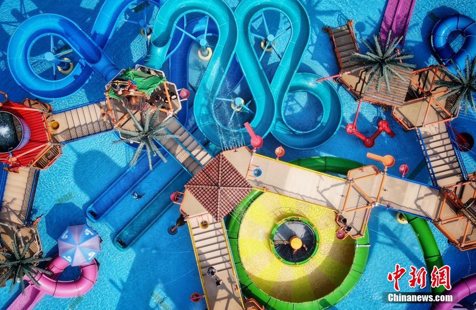 6月10日,航拍江苏溧阳天目湖畔水世界,蓝色的水池、五彩缤纷的戏水器械,犹如“童话世界”引人入胜。中新社记者 泱波 摄