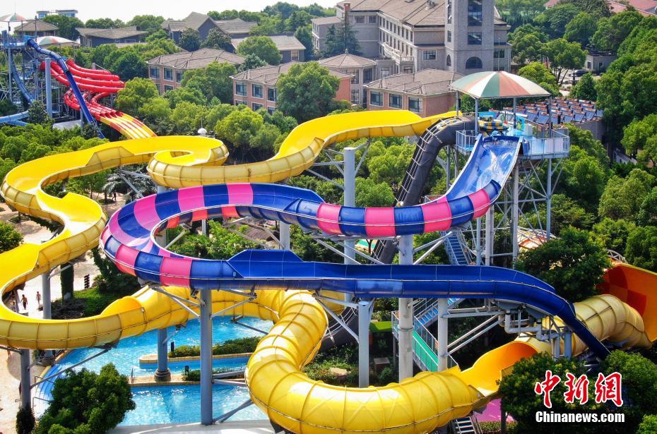 6月10日,航拍江苏溧阳天目湖畔水世界,蓝色的水池、五彩缤纷的戏水器械,犹如“童话世界”引人入胜。中新社记者 泱波 摄