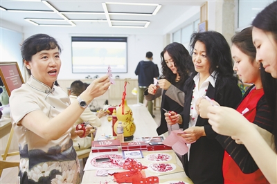 在比什凯克人文大学“中国馆”内,参观者正在体验剪纸等中国非物质文化遗产。记者 韩秉宸摄