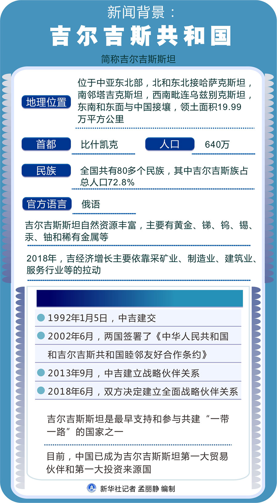 新华社北京6月10日电 吉尔吉斯共和国(简称吉尔吉斯斯坦)是位于中亚东北部的内陆国家,北和东北接哈萨克斯坦,南邻塔吉克斯坦,西南毗连乌兹别克斯坦,东南和东面与中国接壤,领土面积19.99万平方公里,人口640万。