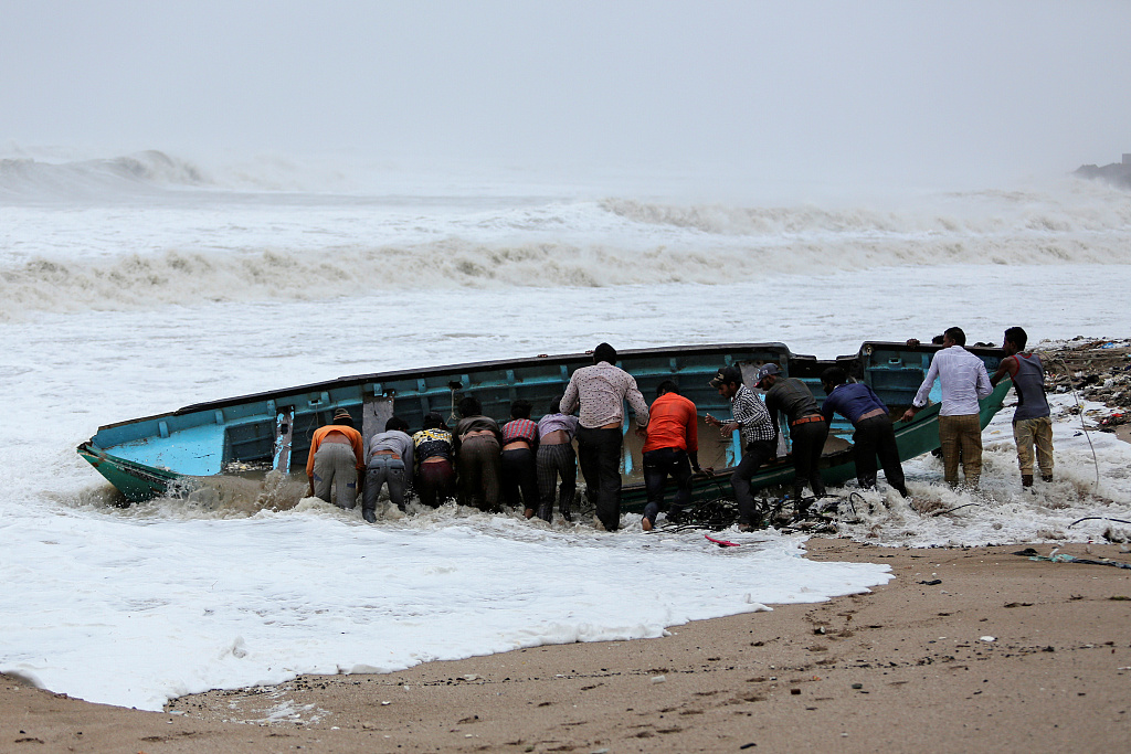 当地时间2019年6月13日,印度Veraval,渔民们在热带气旋“瓦尤”登陆前将渔船移到安全的地方。