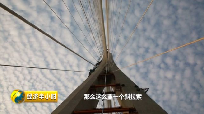 29号主塔是采用塔梁同步施工技术,这项技术是第一次使用。中国中铁大桥局沪通大桥项目部工程部副部长陈涛准备和斜拉索施工方确认斜拉索的梁端戴帽情况。戴帽,就是通过一个巨型螺母将斜拉索固定在钢梁桥面的锚座。斜拉索最长有576米,最重达到83.5吨。