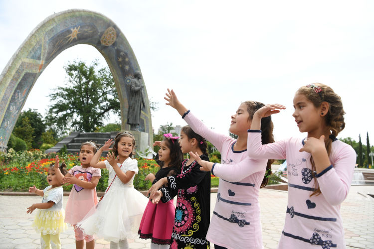 在杜尚别市中心公园,孩子们开心地表演。新华社记者沙达提摄