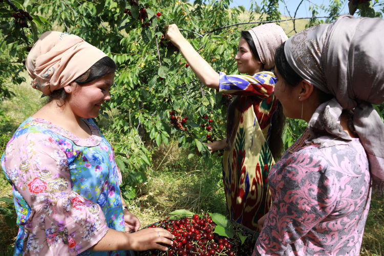 杜尚别西郊吉萨尔盆地,中国商人康忠玉投资的樱桃园绵延数公里。果农尤莉娅说,自己在这里工作了3年,果园目前有4万株果树。农忙时有数百名当地人在这里工作。新华社记者武思宇摄