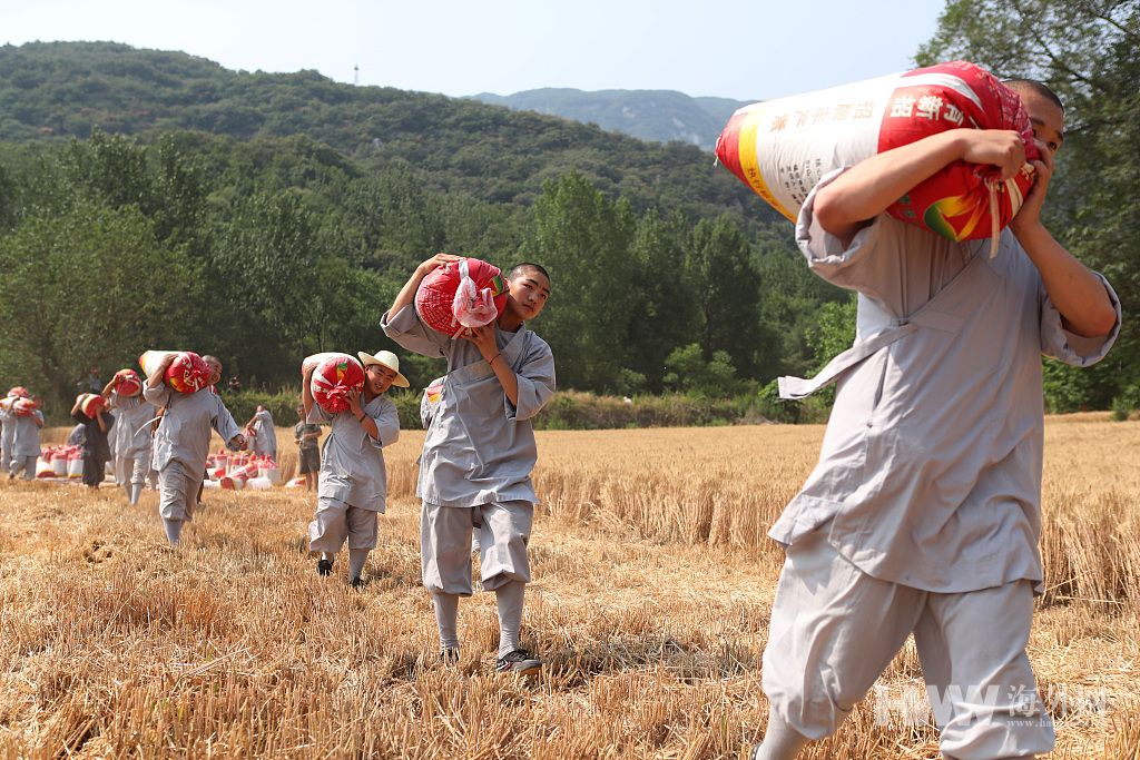 少林寺武僧和洋弟子们戴好草帽,领取镰刀,排队前往少林寺常住院对面的少林寺禅耕农场。
