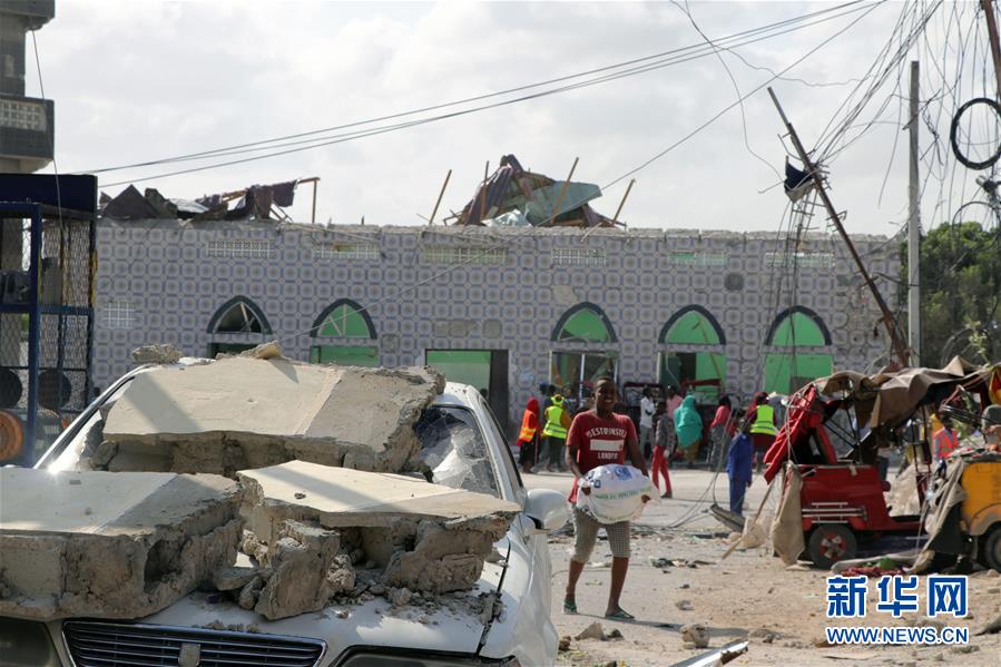 6月15日,在索马里首都摩加迪沙,人们从汽车炸弹袭击损坏的商店中清理物品。 索马里警方15日说,摩加迪沙当天遭到两起汽车炸弹袭击,造成包括袭击者在内的10人死亡、26人受伤。 新华社发(哈桑摄)