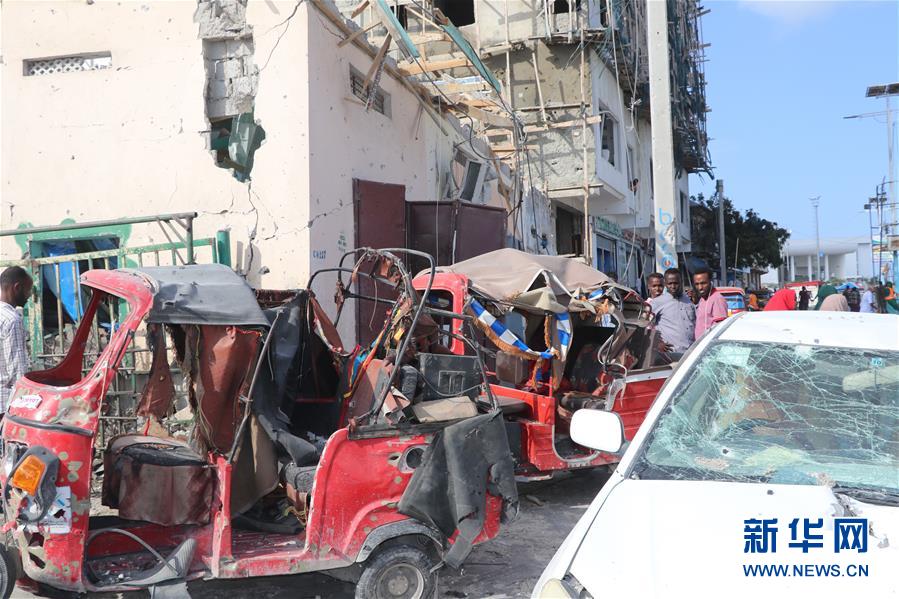 6月15日,在索马里首都摩加迪沙,人们查看汽车炸弹袭击现场。 索马里警方15日说,摩加迪沙当天遭到两起汽车炸弹袭击,造成包括袭击者在内的10人死亡、26人受伤。 新华社发(哈桑摄)
