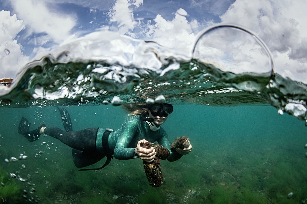 当地时间2019年6月15日,土耳其伊斯坦布尔,自由潜水世界记录保持者萨希卡·埃库门(Sahika Ercumen )参加一项名为“零废物蓝色项目”(Zero Waste Blue Project)的海洋清理活动,潜入海中收集垃圾。