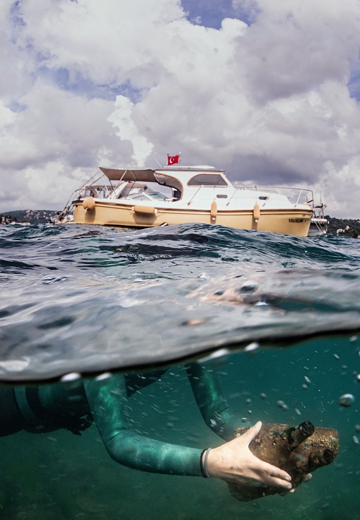 当地时间2019年6月15日,土耳其伊斯坦布尔,自由潜水世界记录保持者萨希卡·埃库门(Sahika Ercumen )参加一项名为“零废物蓝色项目”(Zero Waste Blue Project)的海洋清理活动,潜入海中收集垃圾。