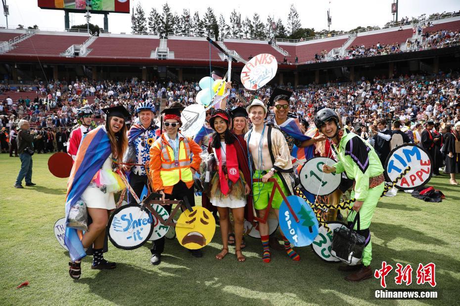 当地时间6月16日,斯坦福大学的毕业生在斯坦福体育馆举行“怪异行走”,庆祝完成学业。毕业典礼以“怪异行走”开场早已成为斯坦福大学的传统,毕业生们或以不同的主题打扮自己,或与同学形成组合进行群体装扮。除了打扮得标新立异之外,许多参加“怪异行走”的毕业生还会带上标语牌,来表达感情或者立场。斯坦福大学官网公布的初步数据显示,今年斯坦福大学将颁发1850个学士学位,2410个硕士学位和1051个博士学位。庆祝活动预计吸引25000至30000名观众。 中新社记者 刘关关 摄