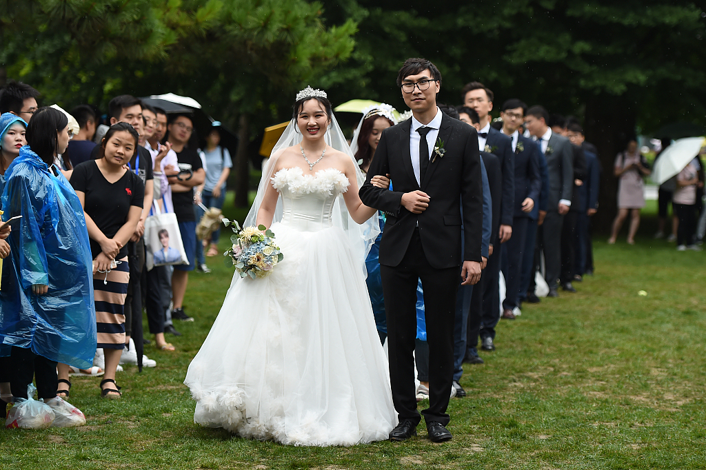2019年6月16日,北京,北京理工大学第三届研究生毕业集体婚礼在校园内中心花园举行。此次集体婚礼共有15对新人参加。现场座无虚席,新人们的老师、同学和亲朋好友一起见证了神圣而庄严的校园婚礼。据了解,在这15对新人中,新郎或者新娘至少有一方是北理工今年的毕业生。图片来源:视觉中国