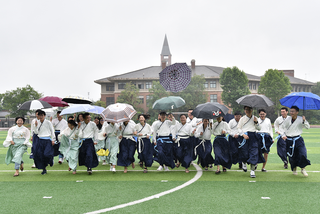 2019年6月17日,武汉进入梅雨季节,大学毕业生雨中撑伞拍摄毕业照。