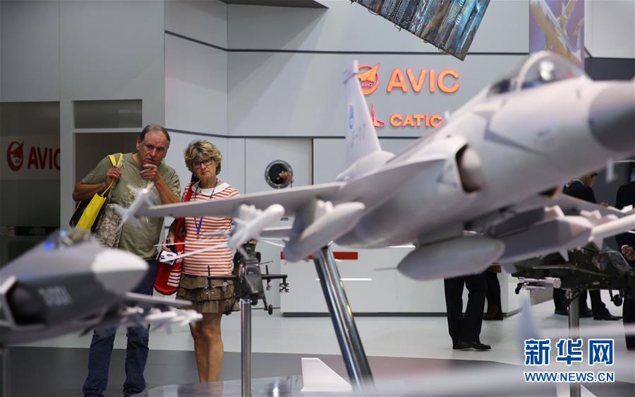 第53届巴黎-布尔歇国际航空航天展览会(巴黎航展)17日正式开幕,多家中国航空航天企业携最新产品和设备亮相。图为人们参观中国航空工业集团公司展区。