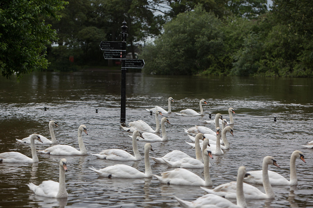 英国伍斯特郡暴雨引发洪灾 天鹅结队游泳上街
