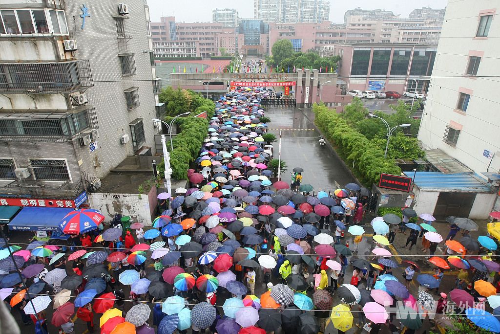 江苏南通中考结束 家长雨中接孩子