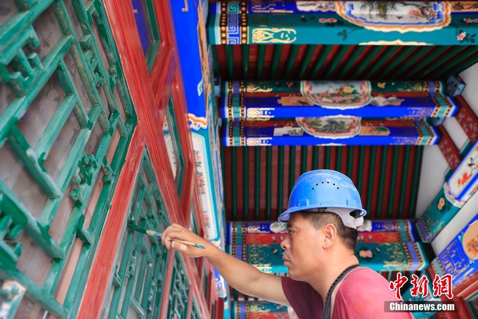 6月19日,工作人员正对北京大兴国际机场航站楼内建筑单体进行墙面修补。目前机场建设已进入收尾阶段。北京大兴国际机场自2014年12月26日启动建设,按照建设和运营筹备总进度综合管控计划安排,将于今年6月30日竣工验收。图为工作人员为航站楼内仿古建筑涂刷上色。中新社记者 殷立勤 摄