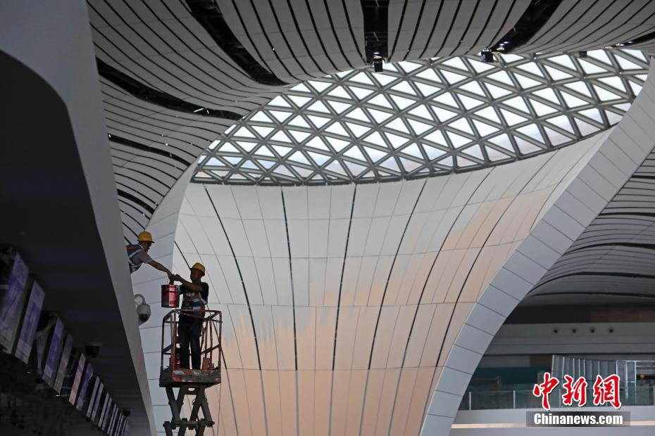 6月19日,工作人员正对北京大兴国际机场航站楼内建筑单体进行墙面修补。目前机场建设已进入收尾阶段。北京大兴国际机场自2014年12月26日启动建设,按照建设和运营筹备总进度综合管控计划安排,将于今年6月30日竣工验收。中新社记者 殷立勤 摄