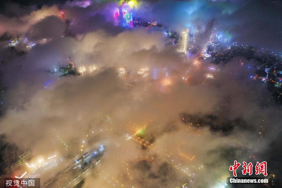 青岛夜空现平流雾景观 灯若繁星夜景旖旎