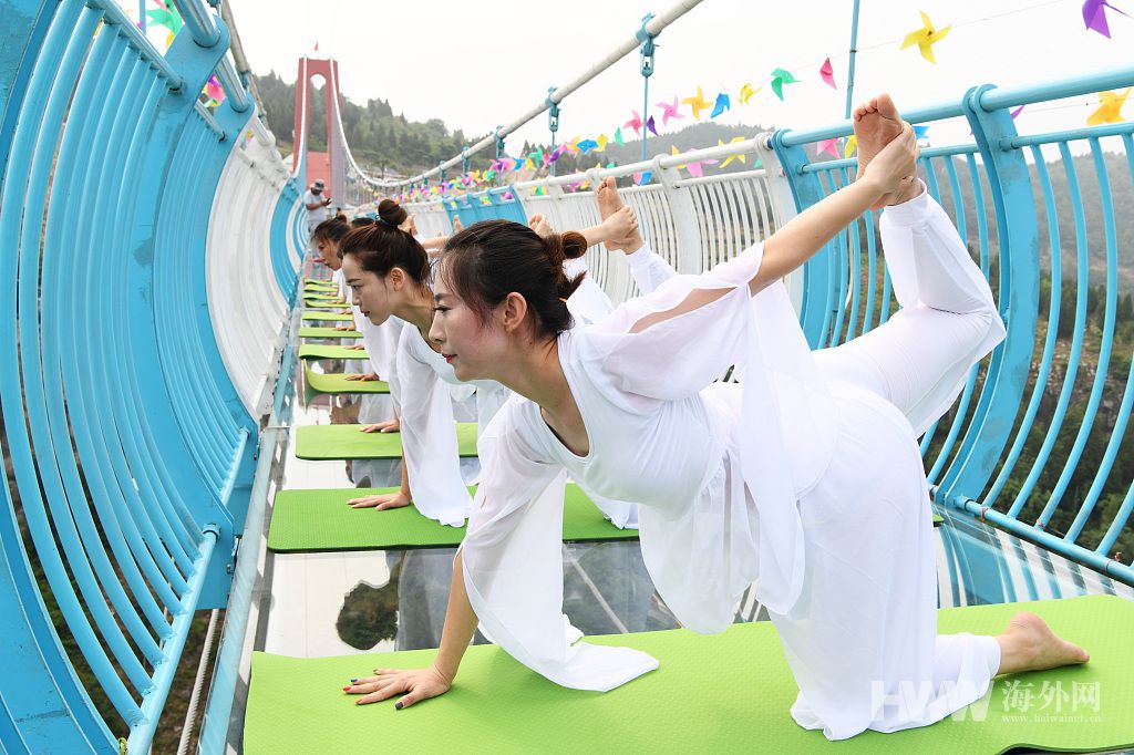 2019年6月20日,山东枣庄,山亭区梵雅瑜伽馆的15名瑜伽爱好者来到徐庄镇梅花山,在距离谷底100多米的玻璃吊桥上练习瑜伽,挑战自我,愉悦身心,感受自然,迎接国际瑜伽日的到来。