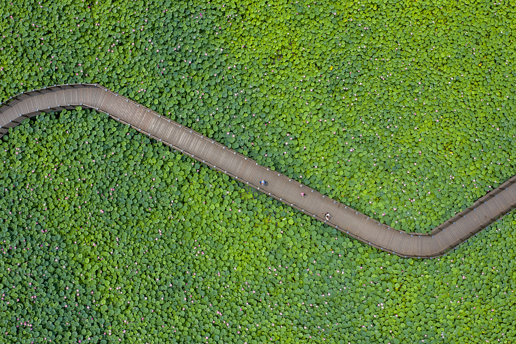 2019年6月21日,夏至时节,山东滨州市十里荷塘景区荷花盛开,满池绿色的荷叶衬托着粉色、白色的荷花分外美丽,吸引着游客及各幼儿园的孩子们纷至沓来赏荷。