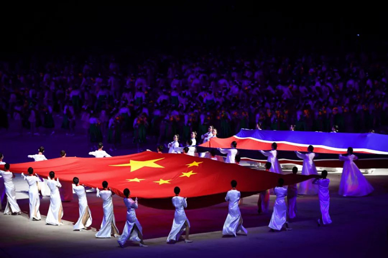 当地时间晚9时40分许,习近平和夫人彭丽媛在金正恩和夫人李雪主陪同下,来到体育场主席台。在场观众全体起立,以热烈的掌声和欢呼声,欢迎中国贵宾的到来。