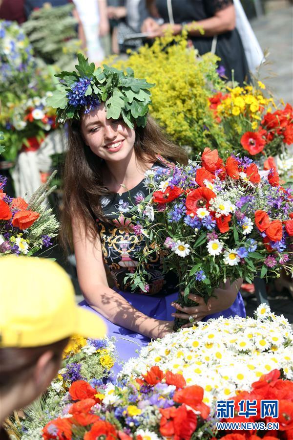 6月21日,在拉脱维亚首都里加的多姆广场,一名女子头戴花环。 新华社发(艾迪斯·帕伦斯摄)