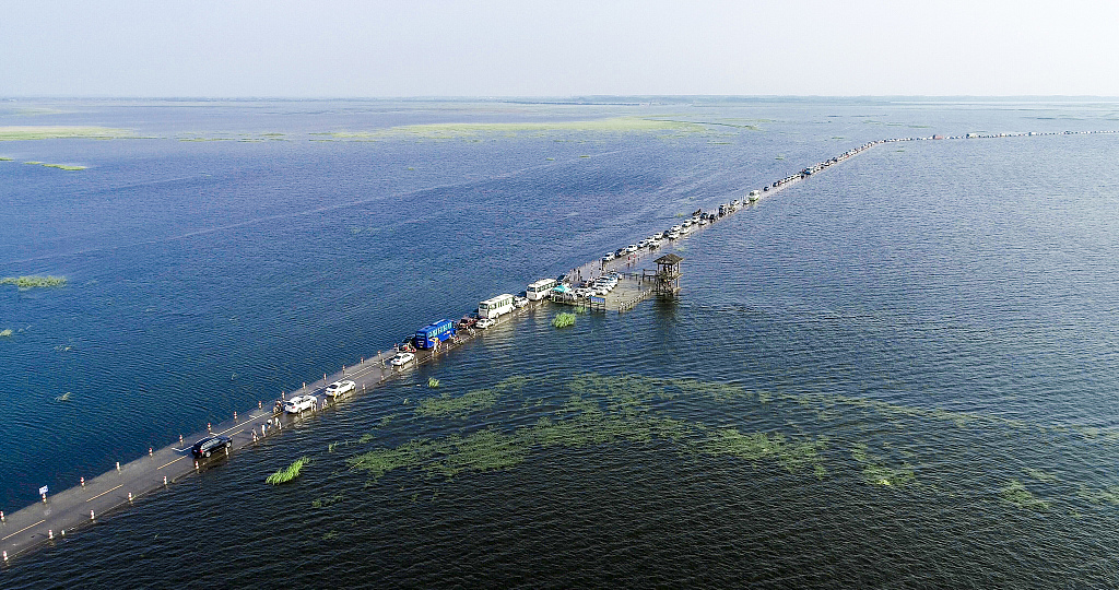 2019年6月23日,江西九江,被网友誉为"最美水上公路"的永吴公路大湖池段再现水上美景,吸引众多游人前来观看。