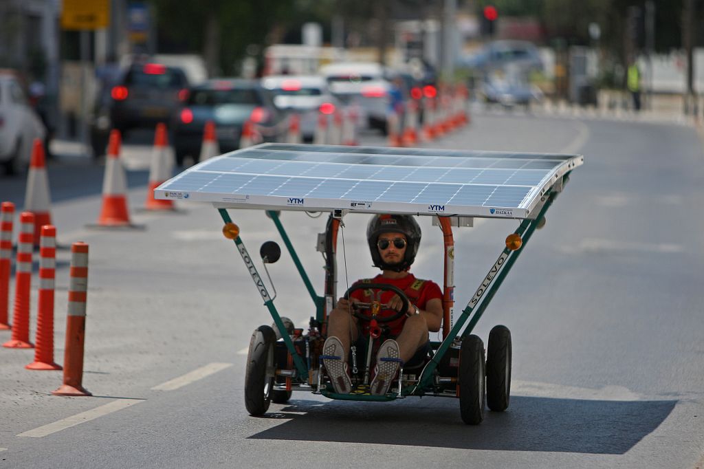 当地时间2019年6月23日,塞浦路斯尼科西亚,当地举行太阳能车赛,选手驾驶太阳能车上路。来源:视觉中国
