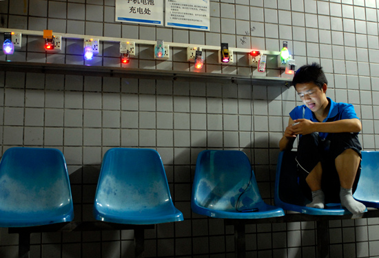 2012年5月9日,广东省东莞市,打工者在集体宿舍的手机充电处。视觉中国供图