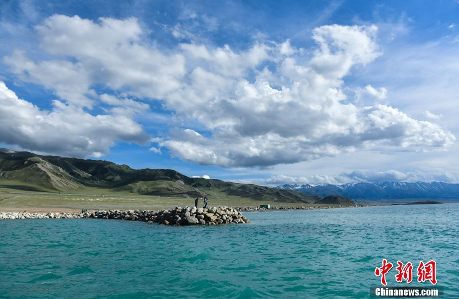进入六月中旬,新疆赛里木湖景区内,湛蓝的湖水与天一色,同远处山峰相映成画,景色迷人,吸引游客来此游玩、避暑。赛里木湖位于天山山脉,湖面海拔两千多米,水域面积450多平方公里,是新疆海拔最高、面积最大的高山湖泊。图为6月15日,游客在赛里木湖景区欣赏夏日美景。中新社记者 张兴龙 摄