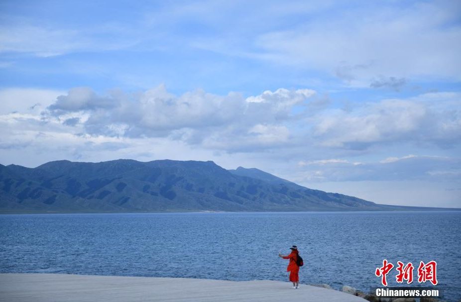进入六月中旬,新疆赛里木湖景区内,湛蓝的湖水与天一色,同远处山峰相映成画,景色迷人,吸引游客来此游玩、避暑。赛里木湖位于天山山脉,湖面海拔两千多米,水域面积450多平方公里,是新疆海拔最高、面积最大的高山湖泊。图为6月15日,游客在景区内拍照留念。中新社记者 张兴龙 摄