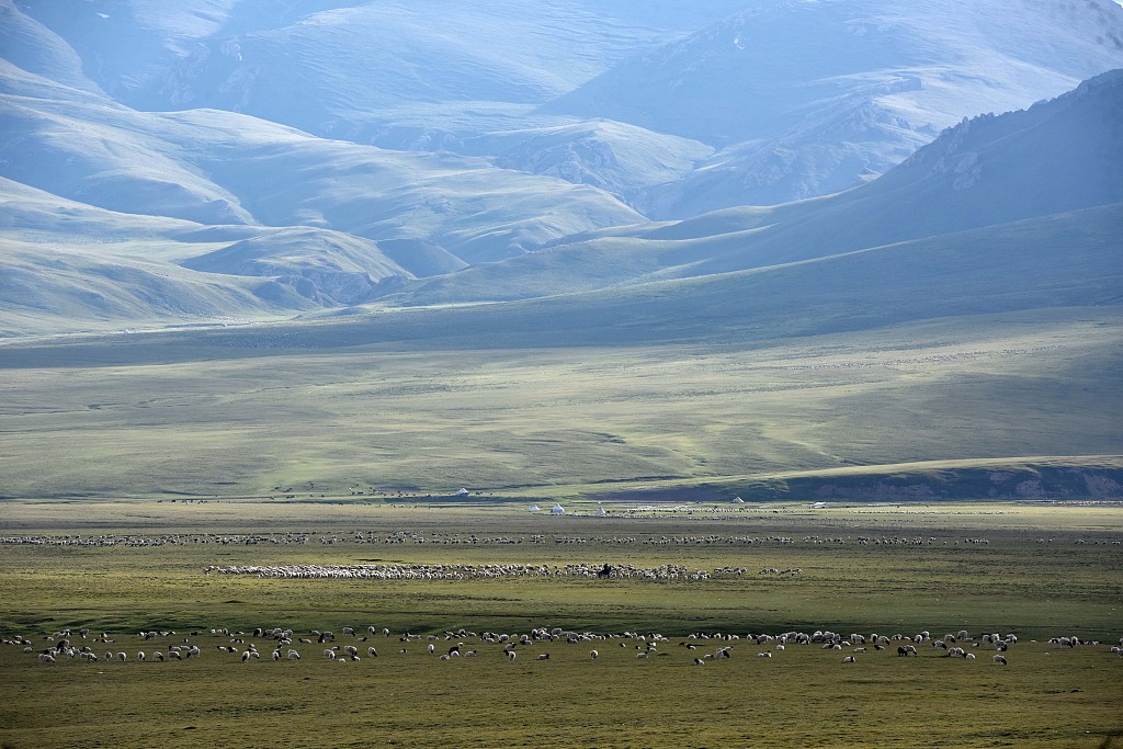 新疆巴州:航拍巴音布鲁克草原 羊群如“散落的珍珠”