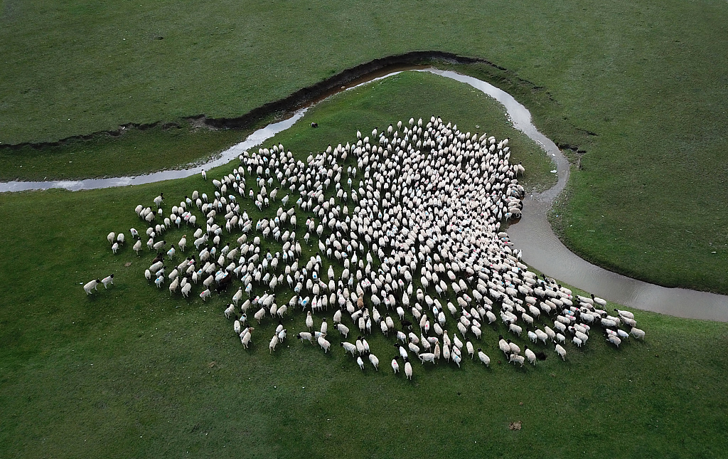 新疆巴州:航拍巴音布鲁克草原 羊群如“散落的珍珠”