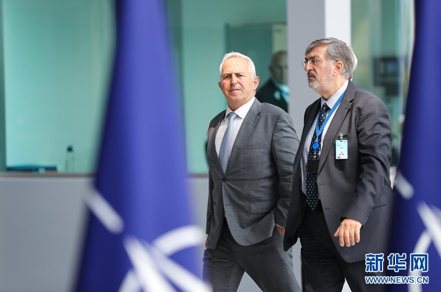 6月26日,在位于比利时布鲁塞尔的北约总部,希腊国防部长阿波斯托拉基斯(左)准备出席北约国防部长会议。 当日,北约国防部长会议在位于布鲁塞尔的北约总部举行。 新华社记者张铖摄
