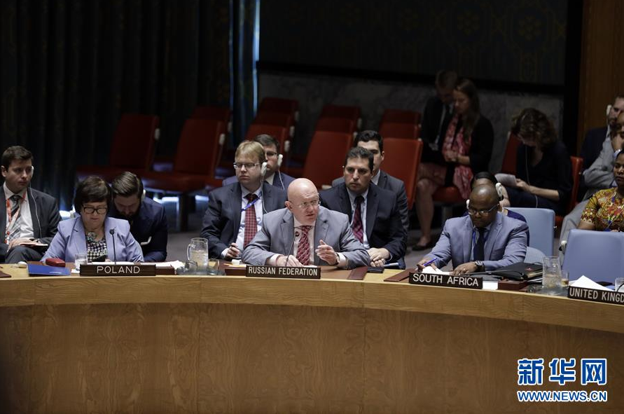 6月26日,在位于纽约的联合国总部,俄罗斯常驻联合国代表涅边贾(前中)在安理会伊核问题公开会上发言。 联合国负责政治和维和事务的副秘书长迪卡洛26日表示,美国和伊朗两国近来一系列举措使来之不易的伊核问题全面协议面临挑战,各方仍须从大局出发,继续执行伊核协议。 新华社记者李木子摄