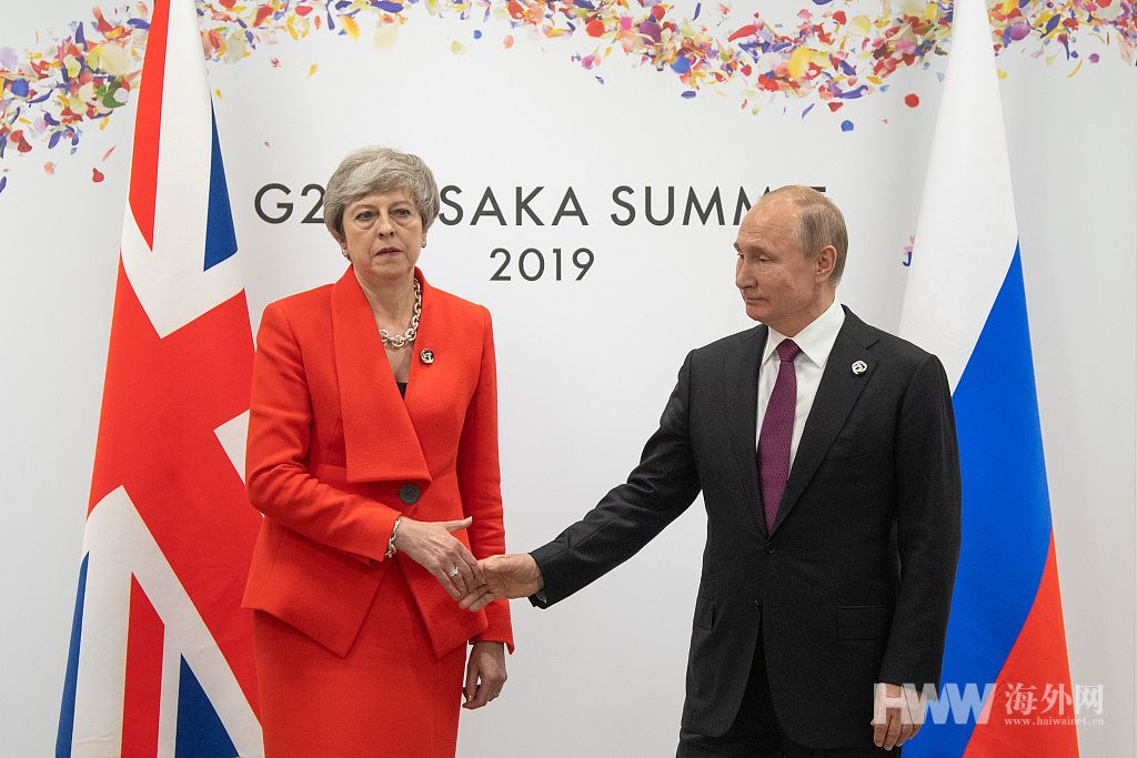 当地时间2019年6月28日,日本大阪,二十国集团领导人第十四次峰会开幕,英国首相特雷莎·梅与俄罗斯总统普京举行会晤。(图:视觉中国)