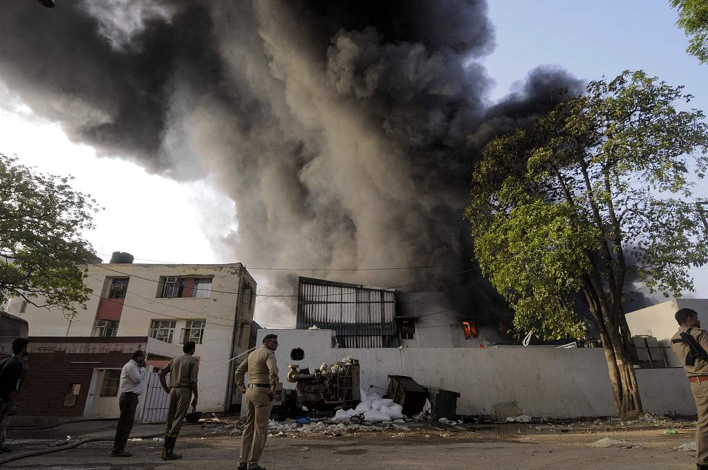 当地时间2019年7月1日,印度诺伊达,当地一家生产塑料制品的私营工厂发生火灾,目前尚无人员伤亡报告。图片来源:视觉中国。