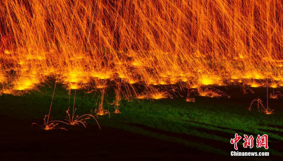 7月1日晚,河南民间打铁花艺人为江西新余市仙女湖区凯光亚热带植物园的游客表演国家级非物质文化遗产项目——打铁花。初夏时节,来自北方的打铁花表演者一展绝技,高温之下的朵朵铁花绽放夏日夜空,如天女散花般绚烂夺目,令南方游客赞叹不已。据了解,打铁花,是流传于豫晋地区民间传统的烟火,至今已有千余年的历史。