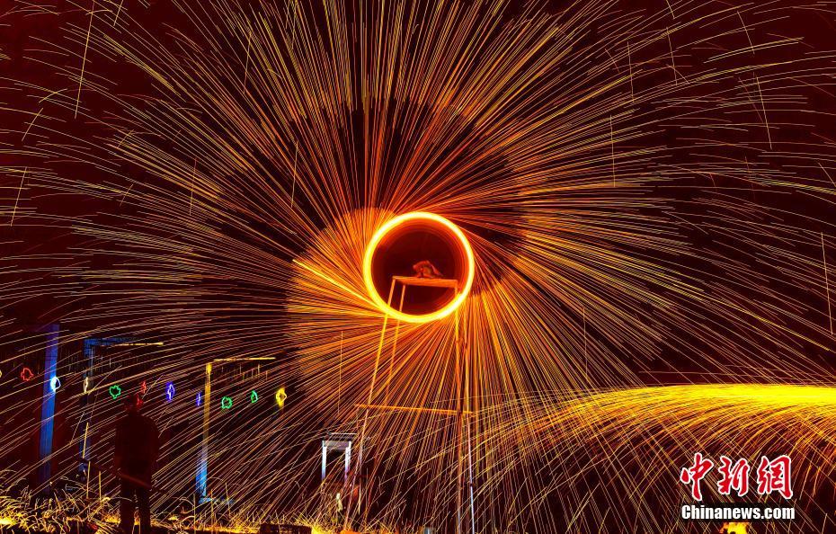 北方非遗文化“打铁花”绽放南方夜空