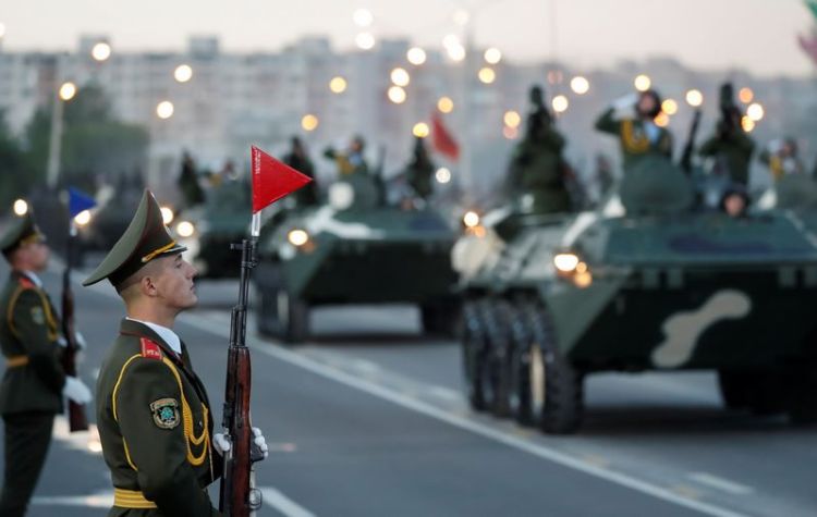 7月3日,在白俄罗斯首都明斯克,军人参加阅兵式。新华社/路透