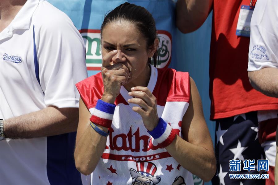 7月4日,在美国纽约康尼岛,一名女选手参加吃热狗大赛。 当日,美国纽约康尼岛举行一年一度的吃热狗大赛。在男子组比赛中,来自加州的乔伊·切斯特纳特10分钟内吃下71个热狗卫冕成功。在女子组比赛中,三木须藤10分钟内吃下31个热狗,连续第六次赢得冠军。 新华社记者 李木子 摄