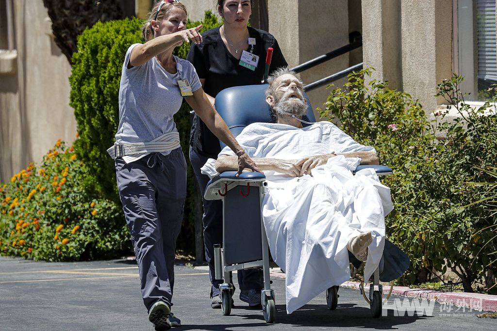 当地时间2019年7月4日,美国南加州科恩郡里奇克莱斯特(Ridgecrest)附近发生里氏6.4级地震,患者从医院撤离到安全地带。(图:视觉中国)