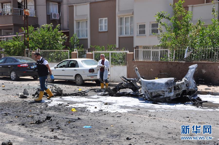 7月5日,在土耳其哈塔伊省雷伊汉勒,警察检查汽车爆炸事件现场。 新华社发