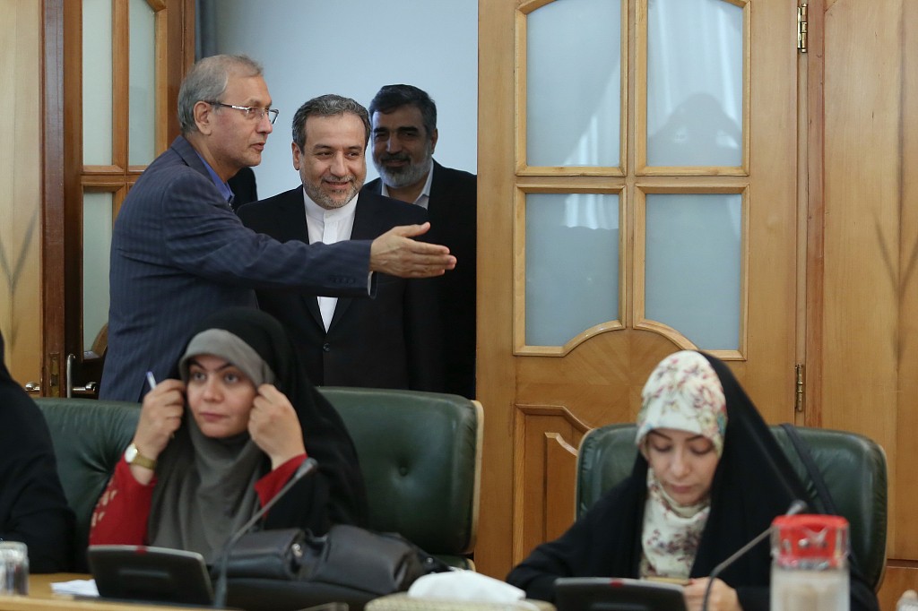 当地时间2019年7月7日,伊朗德黑兰,伊朗副外长阿拉格齐、伊朗原子能组织发言人卡迈勒万迪和伊朗政府发言人Ali Rabiei出席新闻发布会。伊朗政府7日宣布,伊朗正在提高浓缩铀生产丰度,将不再受伊朗核问题全面协议对伊朗只能生产丰度上限为3.67%浓缩铀规定的限制。