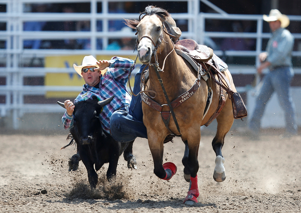当地时间2019年7月7日,加拿大卡尔加里市,当地持续举办牛仔节,民众参加驯马和骑牛活动。图片来源:视觉中国